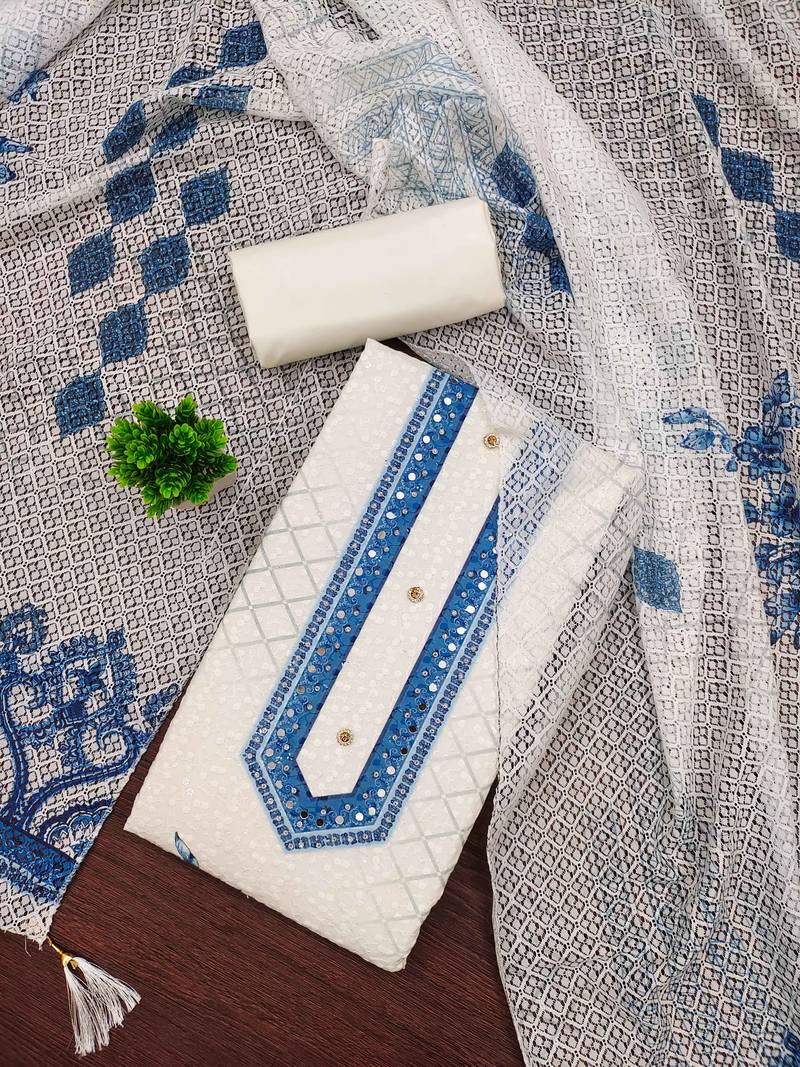 If you find the product for less we'll match it! Know MoreTrendsetting Heavy Thread Siffly Embroidery, Daimond And Fancy Border With Designer Printed Work Dupatta Straight Style 2.00 Mtr Unstitched Dress Material Top Of Multi Colour Cotton Fabric Also Including 2.00 Mtr Chudidar Style Bottom Piece Material Of White Colour Cotton Fabric With 2.00 Mtr Dupatta Of Multi Colour Cotton Fabric By Shadow & Saining Brand