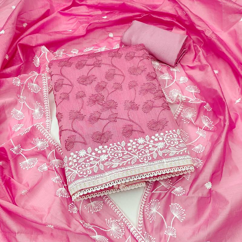 Pink Embroidered Chanderi Semi Stitched Churidar Dress Materials