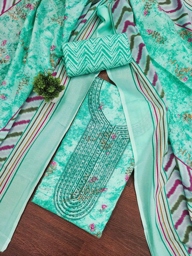 If you find the product for less we'll match it! Know MoreColorfast Designer Print And Fancy Gala Work With Stylish Dupatta Straight Style 2.00 Mtr Unstitched Dress Material Top Of Sea Green Colour Cotton Fabric Also Including 2.00 Mtr Chudidar Style Bottom Piece Material Of Sea Green Colour Cotton Fabric With 2.00 Mtr Dupatta Of Multi Colour Cotton Fabric By Shadow & Saining Brand