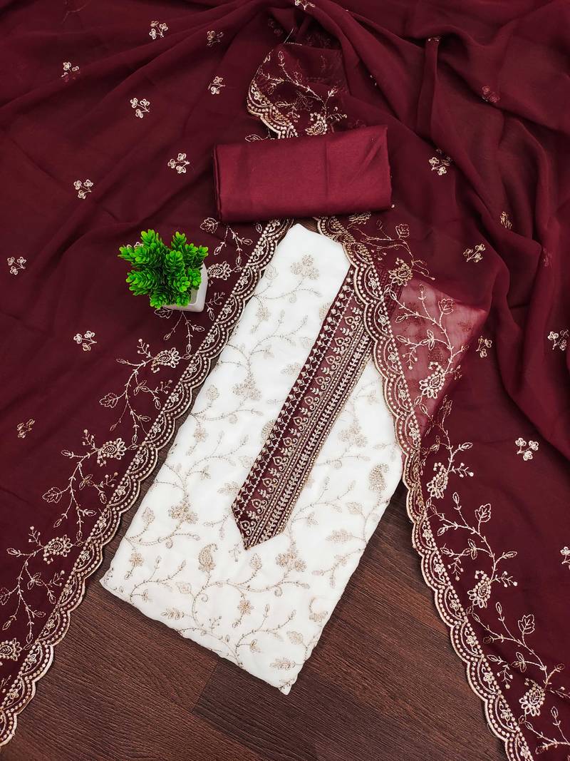 If you find the product for less we'll match it! Know MoreWrinkle-Resistant Heavy Zari Embroidery And Fancy Border With Designer Embroidered Dupatta Straight Style 2.00 Mtr Unstitched Dress Material Top Of White Colour Georgette Fabric With 2 Mtr Santoon As Lining Inner Fabric Also Including 3.60 Mtr Unstiched Bottom Material Of Maroon Colour Santoon Fabric With 2.00 Mtr Dupatta Of Maroon Colour Georgette Fabric By Shadow & Saining Brand