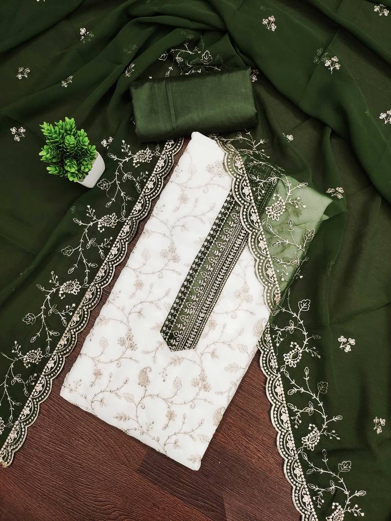 If you find the product for less we'll match it! Know MoreColorfast Heavy Zari Embroidery And Fancy Border With Designer Embroidered Dupatta Straight Style 2.00 Mtr Unstitched Dress Material Top Of White Colour Georgette Fabric With 2 Mtr Santoon As Lining Inner Fabric Also Including 3.60 Mtr Unstiched Bottom Material Of Green Colour Santoon Fabric With 2.00 Mtr Dupatta Of Green Colour Georgette Fabric By Shadow & Saining Brand