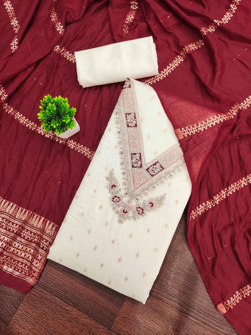 If you find the product for less we'll match it! Know MoreLimited-Edition Designer Weaving Embroidered Neck And Fancy Border With Stylish Woven Dupatta Straight Style 2.00 Mtr Unstitched Dress Material Top Of White Colour Modal Fabric With 2 Mtr Santoon As Lining Inner Fabric Also Including 3.60 Mtr Unstiched Bottom Material Of White Colour Santoon Fabric With 2.00 Mtr Dupatta Of Maroon Colour Jacquard Fabric By Shadow & Saining Brand