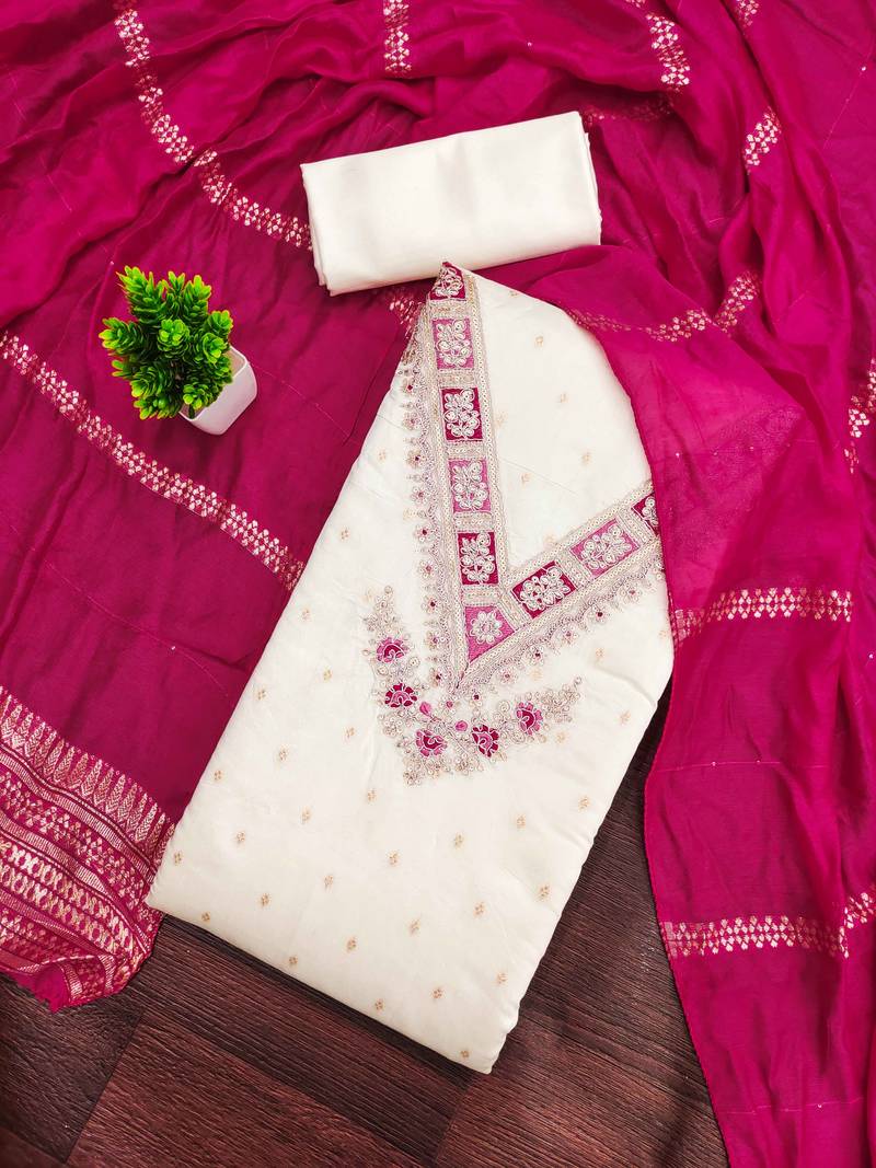 If you find the product for less we'll match it! Know MoreNew-Arrival Designer Weaving Embroidered Neck And Fancy Border With Stylish Woven Dupatta Straight Style 2.00 Mtr Unstitched Dress Material Top Of White Colour Modal Fabric With 2 Mtr Santoon As Lining Inner Fabric Also Including 3.60 Mtr Unstiched Bottom Material Of White Colour Santoon Fabric With 2.00 Mtr Dupatta Of Pink Colour Jacquard Fabric By Shadow & Saining Brand