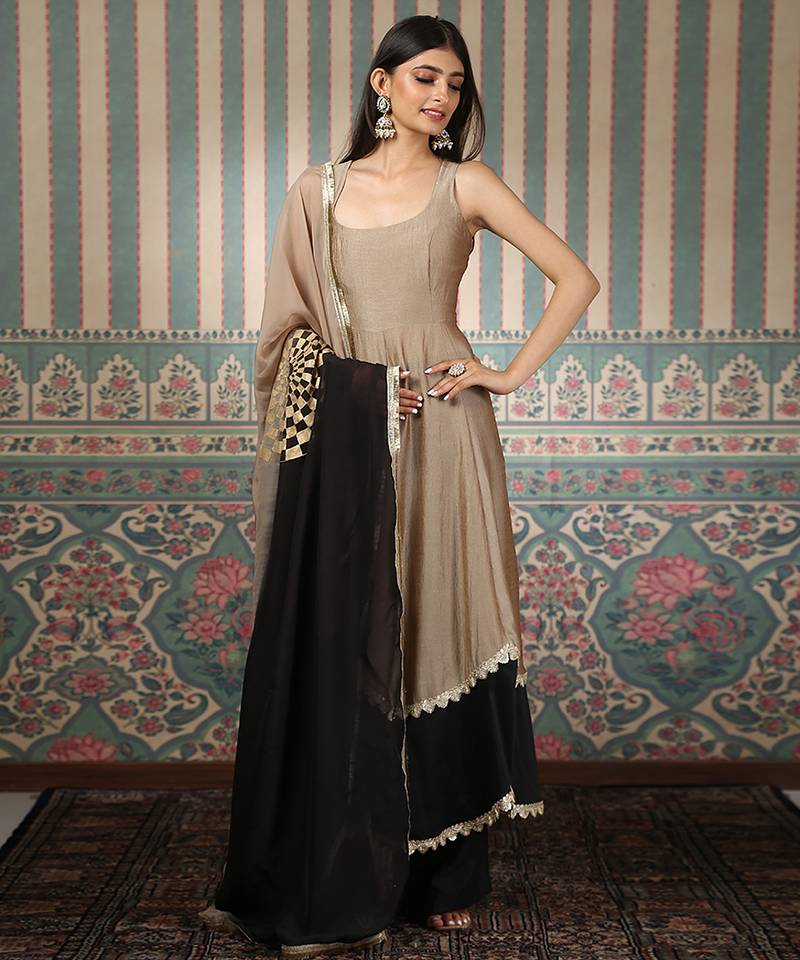 Beige And Green Embroidered Silk Blend Anarkali Set