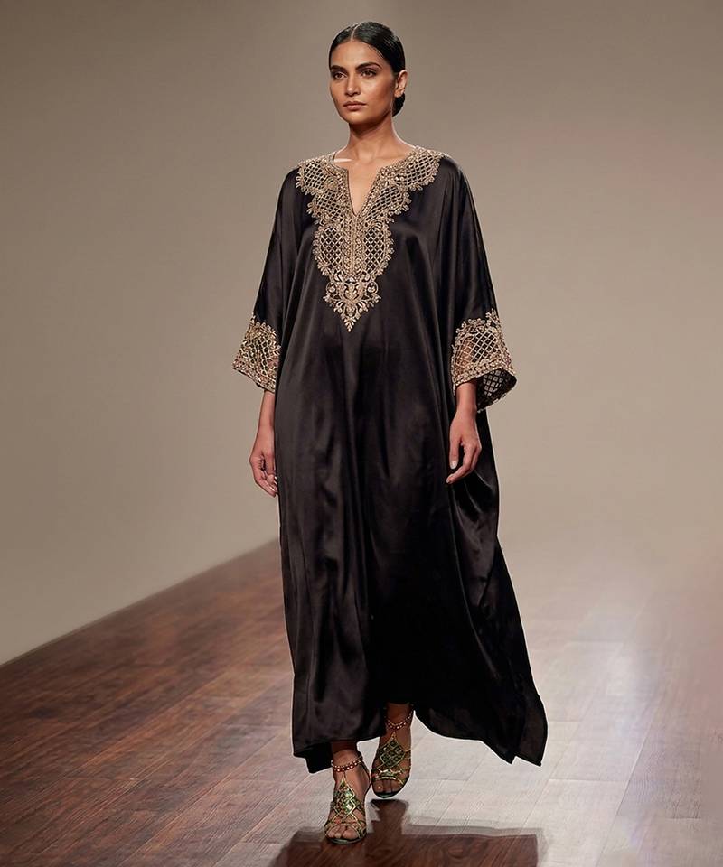 If you find the product for less we'll match it! Know MoreThis Black Modal Satin Kaftan Features Elegant Embroidery That Adds Sophistication And Charm. The Smooth Fabric Offers A Graceful Drape And Comfortable Fit. Perfect For Festive Or Evening Wear, It Pairs Beautifully With Statement Accessories For A Bold And Stylish Look.