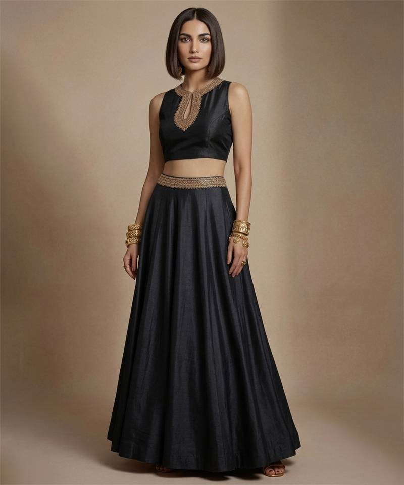 Components: 1 Crop Top :: 1 Skirt• Product Id : 4742489 • Package Details : 1 Crop Top / 1 Skirt • Type : Plus Size Kurtis • Fabric : Silk • Work : Embroidered • Type : Zari Work • Look : Traditional • Sleeve : Sleeveless • Color : Black • Stitching : Stitched • Length : 35.0 General - Color and Texture may have slight variation. This happens because of photography.