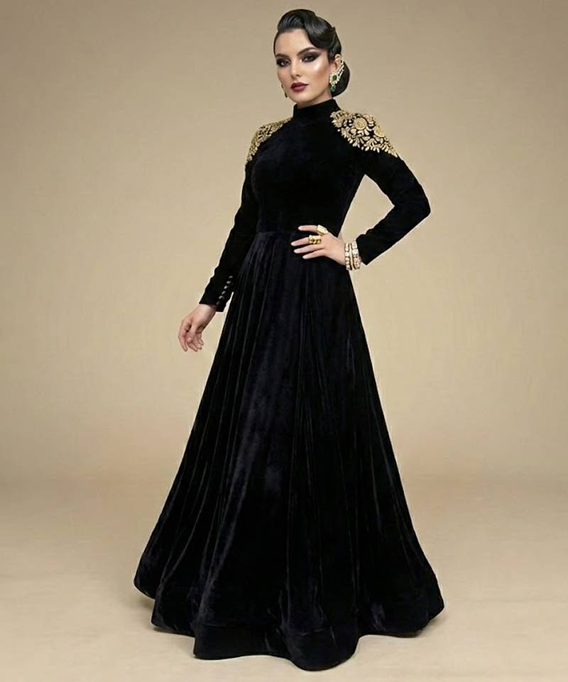 Opulent And Striking, This Black Velvet Gown Features Intricate Embroidery That Adds Royal Character. The Rich Texture Enhances Its Evening Appeal, While The Flowing Silhouette Creates Effortless Elegance. Perfect For Receptions, Festive Nights, Or Formal Occasions, This Gown Is Designed To Make A Bold, Graceful Statement.