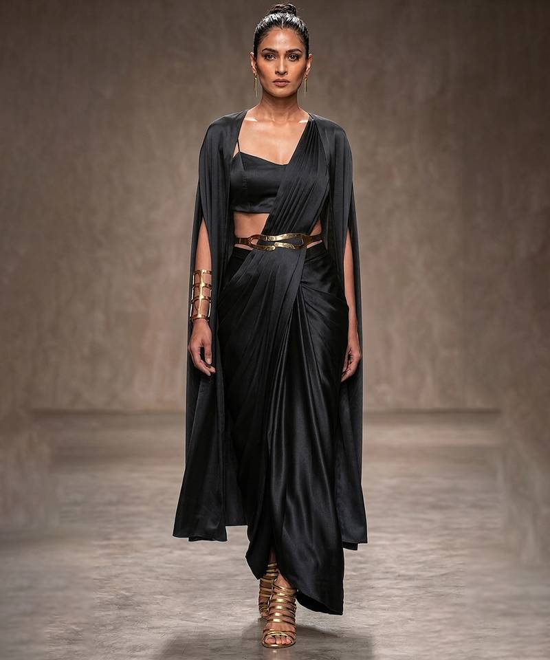 Components: 1 Saree::1 Blouse::1 Cape• Saree : Color- Black / Fabric- Satin • Blouse : Color- Black / Fabric- Satin Saree Details