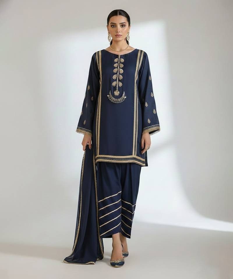 This Elegant Blue Satin Kurta Set Blends Smooth Sheen With Intricate Embroidery For A Refined Festive Look. The Soft Drape Of Satin Enhances Comfort While The Detailed Threadwork Adds Richness. Perfect For Evening Gatherings, Celebrations, Or Intimate Weddings, It Delivers Grace, Polish, And Timeless Ethnic Charm In One Ensemble.
