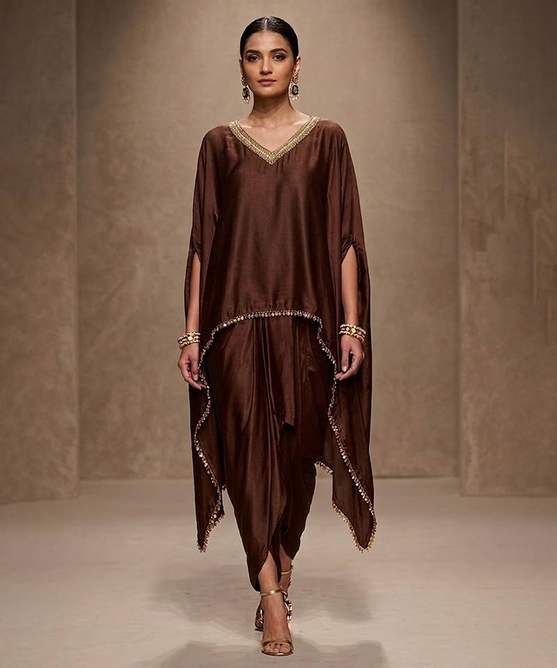 Components: 1 Kaftan :: 1 Dhoti Pant• Product Id : 4745366 • Package Details : 1 Kaftan / 1 Dhoti Pant • Type : Kaftans • Work : Embroidered • Type : Zari Work • Look : Fashion • Sleeve : Half Sleeve • Color : Brown • Stitching : Stitched • Fabric : Modal • Length : 45.0 General - Color and Texture may have slight variation. This happens because of photography.