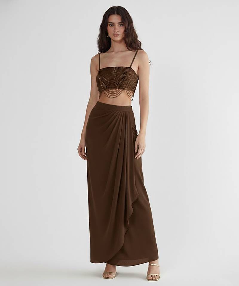 • Product Id : 4699385 • Package Details : 1 Top / 1 Skirt • Type : Co Ord Sets • Fabric : Silk • Work : Embroidered • Sleeve : Sleeveless • Color : Brown • Stitching : Stitched • Length : 35.0 Payments [+]