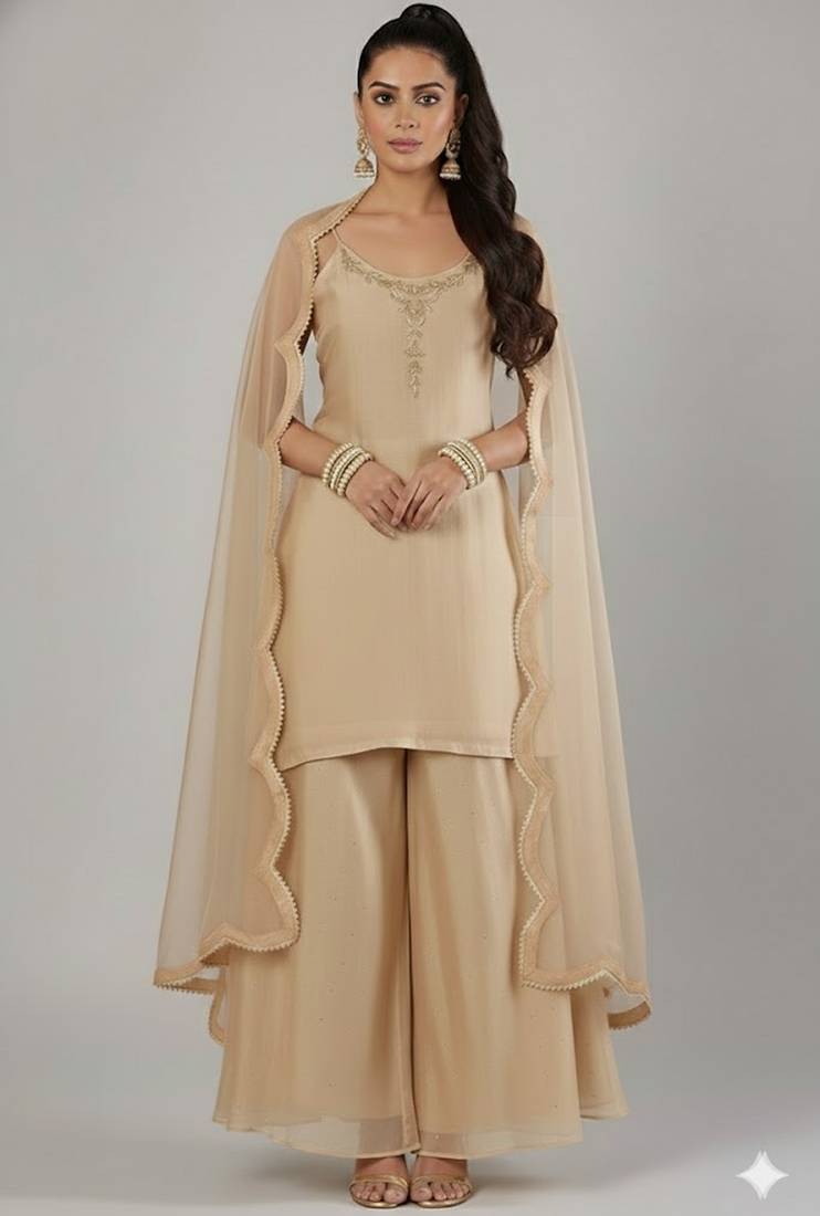 • Product Id : 4711595 • Package Details : 1 Top / 1 Bottom / 1 Dupatta • Type : Plus Size Kurtis • Fabric : Silk • Work : Embroidered • Sleeve : Sleeveless • Color : Gold • Stitching : Stitched • Length : 35.0 Payments [+]