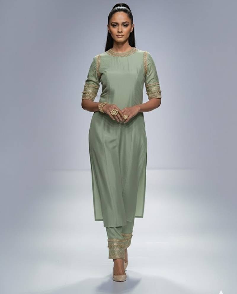 Green Chanderi Plain Kurta Set
