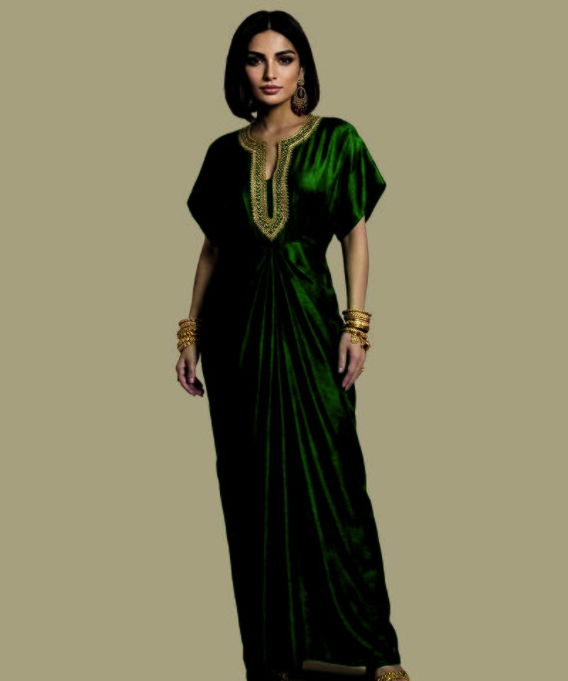 Crafted In Luxurious Raw Silk, This Green Kaftan Features Intricate Embroidery That Adds Elegance To Its Relaxed Silhouette. Designed For Comfort And Style, It Drapes Beautifully, Making It Ideal For Festive Gatherings Or Intimate Celebrations. Pair It With Statement Accessories For A Refined And Effortlessly Graceful Look.
