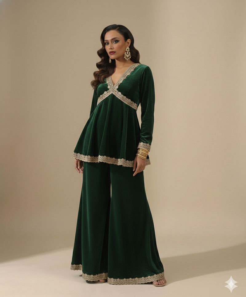 Green Embroidered Velvet Kurta Set