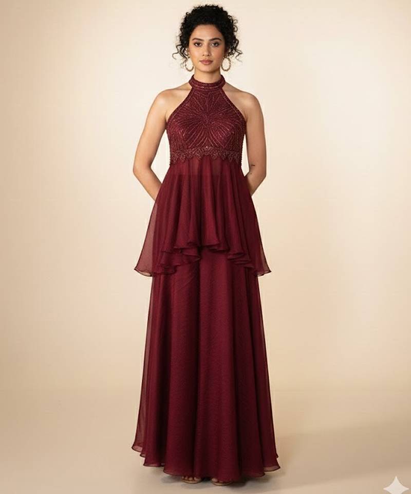 Light, Flowy Chiffon In A Deep Maroon Shade Creates An Effortlessly Elegant Co-Ord Set. The Embroidery Adds A Festive Touch Without Overpowering The Look. Perfect For Evening Gatherings Or Celebrations, This Ensemble Combines Grace, Movement, And A Flattering Silhouette For Refined Ethnic Styling.