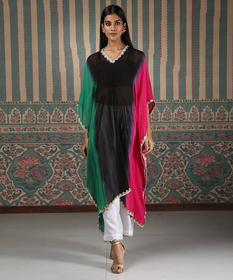 This Multicolor Embroidered Organza Kaftan Radiates Vibrant Elegance And Contemporary Charm. Crafted From Lightweight Organza Fabric, It Features Intricate Multicolor Embroidery That Adds A Rich, Artistic Touch. Perfect For Festive Occasions And Evening Gatherings, It Offers A Graceful Drape, Airy Comfort, And Statement-Making Style.