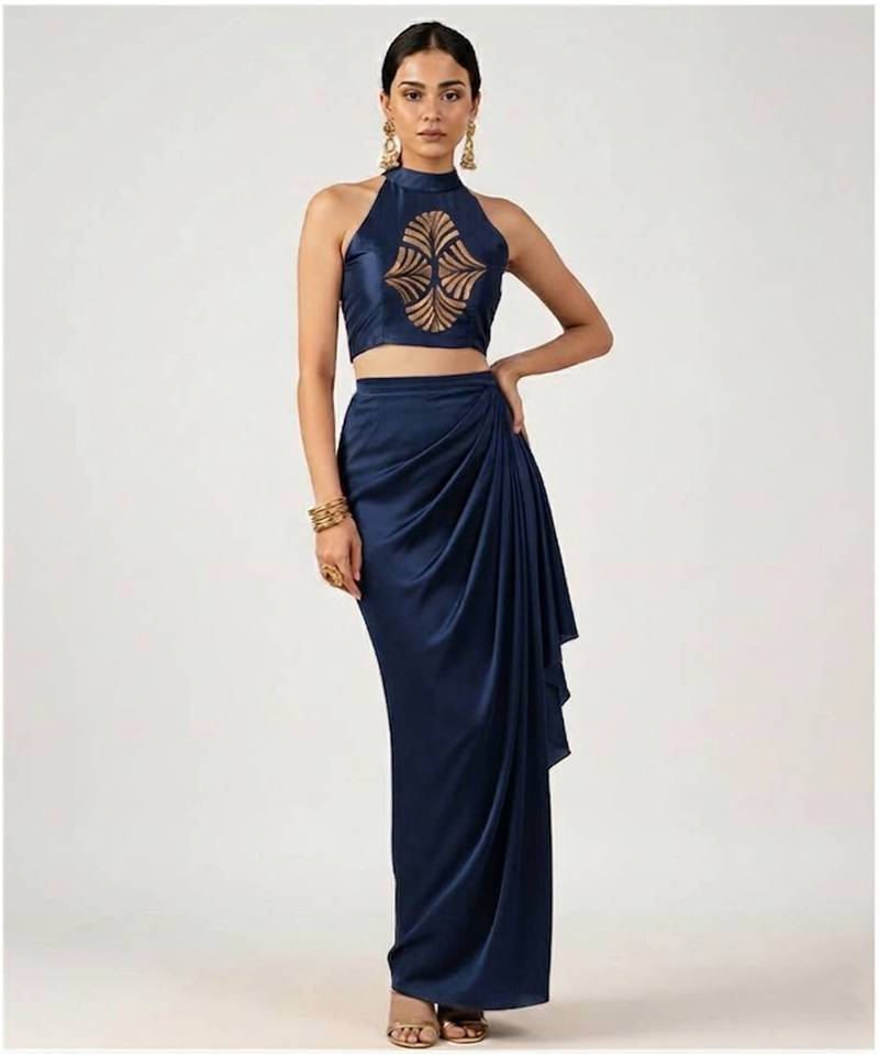 If you find the product for less we'll match it! Know MoreThis Navy Blue Satin Co-Ord Set Showcases Elegant Embroidery That Enhances Its Deep And Refined Appeal. The Smooth Fabric Offers A Subtle Sheen, While The Silhouette Ensures Comfort And Style. Perfect For Festive Occasions, It Pairs Effortlessly With Statement Accessories For A Sophisticated Look.
