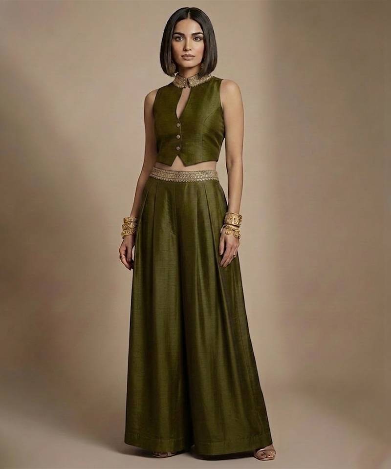 Components: 1 Waistcoat :: 1 Palazzo Pant• Product Id : 4754120 • Package Details : 1 Waistcoat / 1 Palazzo Pant • Type : Plus Size Kurtis • Work : Embroidered • Type : Gota Patti • Look : Traditional • Sleeve : Sleeveless • Fabric : Raw Silk • Color : Olive • Stitching : Stitched • Length : 35.0 General - Color and Texture may have slight variation. This happens because of photography.