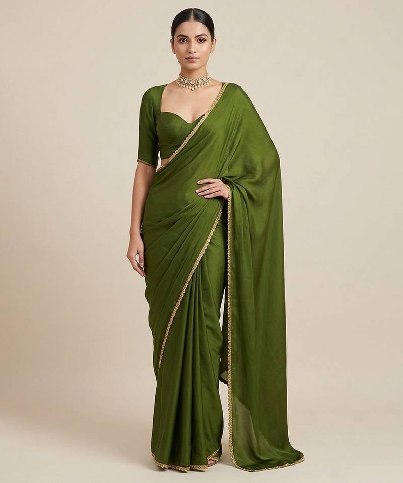 This Olive Green Mul Cotton Saree Set Features Delicate Lace Detailing That Enhances Its Soft And Elegant Appeal. The Breathable Fabric Ensures All-Day Comfort, While The Lightweight Drape Adds Effortless Grace. Perfect For Casual Outings Or Daytime Events, It Pairs Beautifully With Minimal Accessories For A Refined And Understated Look.
