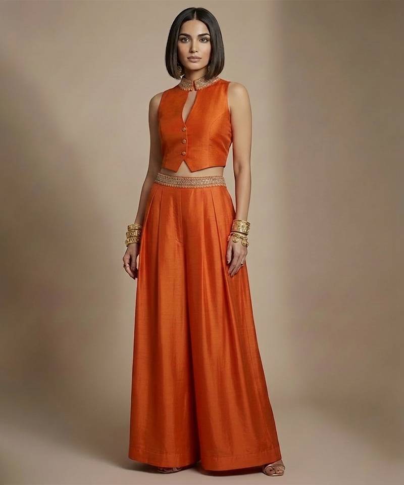 Components: 1 Waistcoat :: 1 Palazzo Pant• Product Id : 4754123 • Package Details : 1 Waistcoat / 1 Palazzo Pant • Type : Co Ord Sets • Work : Embroidered • Type : Gota Patti • Look : Traditional • Sleeve : Sleeveless • Fabric : Raw Silk • Color : Orange • Stitching : Stitched • Length : 35.0 General - Color and Texture may have slight variation. This happens because of photography.