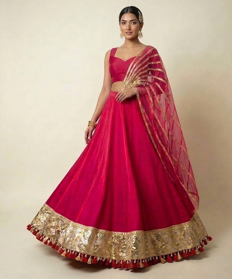 This Rani Pink Silk Lehenga Set Features Exquisite Embroidery That Enhances Its Vibrant And Festive Appeal. The Luxurious Fabric And Flowing Silhouette Create A Striking Look, Perfect For Celebrations And Weddings. Style It With Traditional Jewelry To Achieve A Bold, Elegant, And Timeless Ensemble.