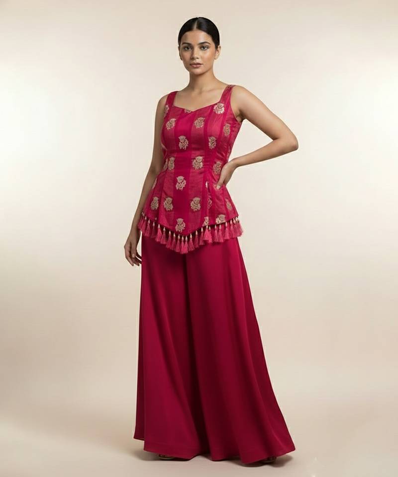 If you find the product for less we'll match it! Know More"This Rani Pink Silk Printed Co-Ord Set Blends Vibrant Color With Artistic Prints For A Chic Ethnic Look. The Smooth Silk Fabric Adds Elegance And Comfort. Perfect For Festive Outings And Stylish Daytime Celebrations.