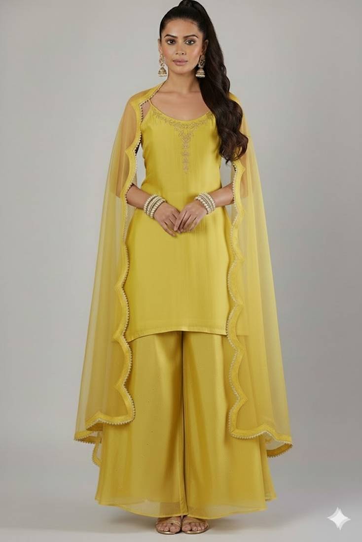 • Product Id : 4711596 • Package Details : 1 Top / 1 Bottom / 1 Dupatta • Type : Plus Size Kurtis • Fabric : Silk • Work : Embroidered • Sleeve : Sleeveless • Color : Yellow • Stitching : Stitched • Length : 35.0 Payments [+]