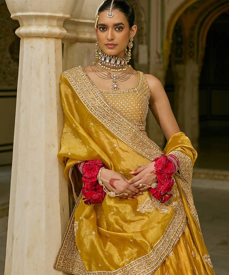 This Yellow Embroidered Silk Lehenga Set Exudes Regal Elegance And Festive Grandeur. Crafted From Luxurious Silk, It Features Intricate Embroidery That Enhances Its Rich Appeal. The Flared Lehenga Paired With A Beautifully Tailored Blouse Creates A Graceful Silhouette, Making It Perfect For Weddings, Celebrations, And Special Occasions With Timeless Sophistication.