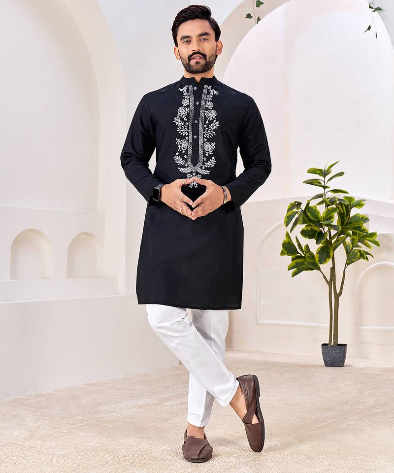 • Product Id : 4678547 • Package Details : 1 Kurta • Type : Kurta • Occasion : Wedding • Work : Embroidered • Type : Thread Work • Look : Traditional • Sleeve : Full Sleeve • Neck Style : Collar Neck Kameez • Color : Black • Top Color : Black • Top Fabric : Art Silk • Fabric : Silk Blend • Stitching : Stitched Payments [+]