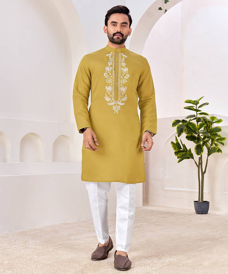 Upgrade your ethnic wardrobe with this elegant men’s kurta crafted from premium Roman silk fabric. Designed in a rich mustard yellow shade, it features fine white thread embroidery on the front panel that adds a touch of traditional charm. The fabric feels smooth, lightweight, and comfortable for long wear. With a straight fit and classic neckline, this kurta is perfect for festive occasions, weddings, and cultural events.