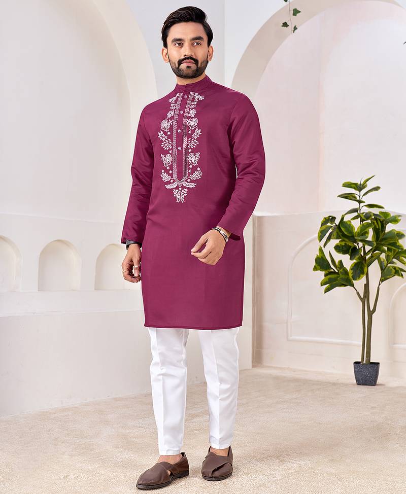 Upgrade your ethnic wardrobe with this elegant men’s kurta crafted from premium Roman silk fabric. Designed in a rich wine shade, it features fine white thread embroidery on the front panel that adds a touch of traditional charm. The fabric feels smooth, lightweight, and comfortable for long wear. With a straight fit and classic neckline, this kurta is perfect for festive occasions, weddings, and cultural events.
