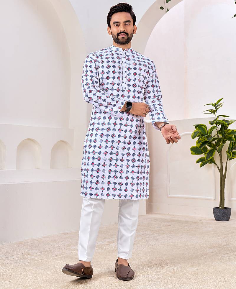 Elevate your ethnic wardrobe with this sharp white cotton kurta featuring a vibrant geometric diamond print in red/pink and blue accents. Made from premium, breathable fabric, it ensures comfort and style for any casual outing, festival, or event. The classic mandarin collar, full sleeves, and regular fit offer a polished look