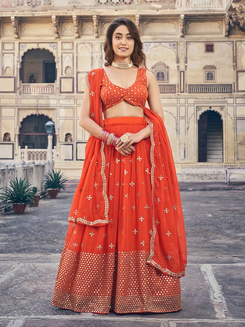 • Fabric : Georgette • Color : Orange • Work : Embroidered • Length : 2.5 Lehenga Details