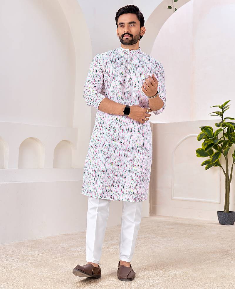 This white cotton kurta features a modern speckled pattern in soft multicolor dots, blending tradition with a fresh contemporary look. Designed for comfort and breathability, it’s perfect for casual outings or festive occasions. The straight cut and full sleeves add a classic touch, making it versatile for various events.
