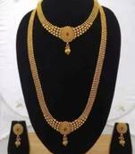 • Product Id : 4150000 • Package Details : 1 Necklace/1 Pair Of Earring/1 Short Necklace • Type : Necklace Sets • Jewellery Work : Gold Plated • Color : Gold • Plating : Yellow Gold • Base Material : Alloy • Height : 15.0 • Care : Avoid Contact With Water & Perfume Payments [+]