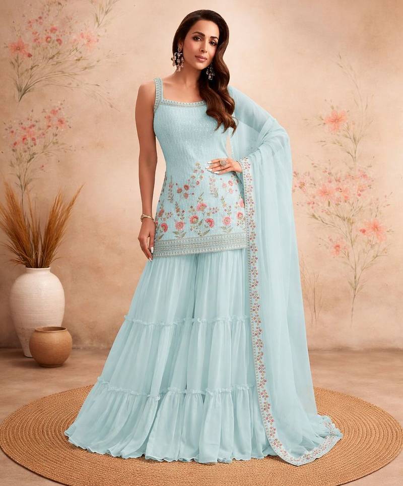 Sky Blue Faux Georgette Sharara Salwar Suit Collection Un Stitched Unstitched