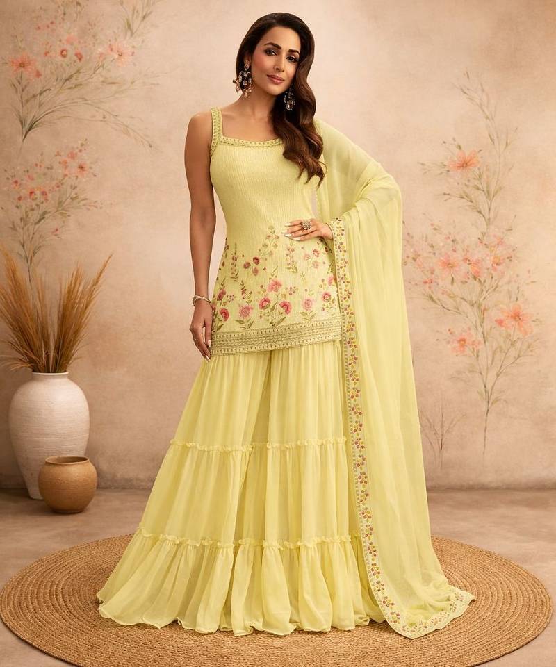 Yellow Faux Georgette Sharara Salwar Suit Collection Un Stitched Unstitched