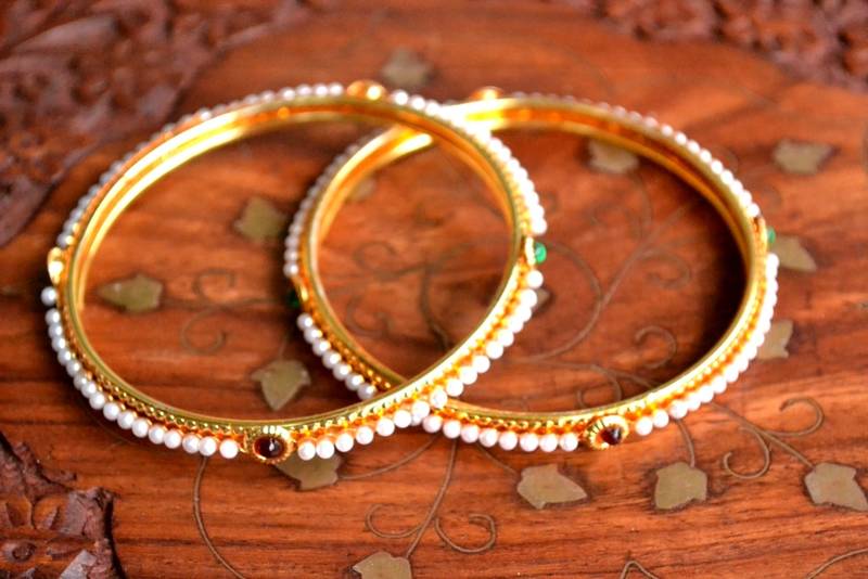 • Product Id : 2214343 • Package Details : Set Of 2 Bangle • Type : Bridal Bangles & Bracelets For Women • Occasion : Festive • Look : Fashion • Jewellery Work : Pearl • Color : Gold • Stone : Pearl • Plating : Yellow Gold • Base Material : Brass • Width : 0 Payments [+]