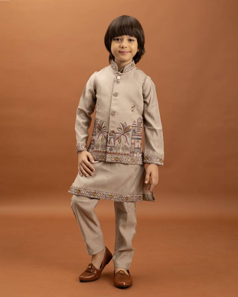 give your little one a classy and royal ethnic look with this beige viscose silk boys kurta set, specially crafted for weddings, festivals, and special celebrations. this elegant traditional outfit includes a straight-fit kurta, matching pant, and a finely embroidered koti (jacket), making it a complete festive and wedding-ready ensemble for boys.