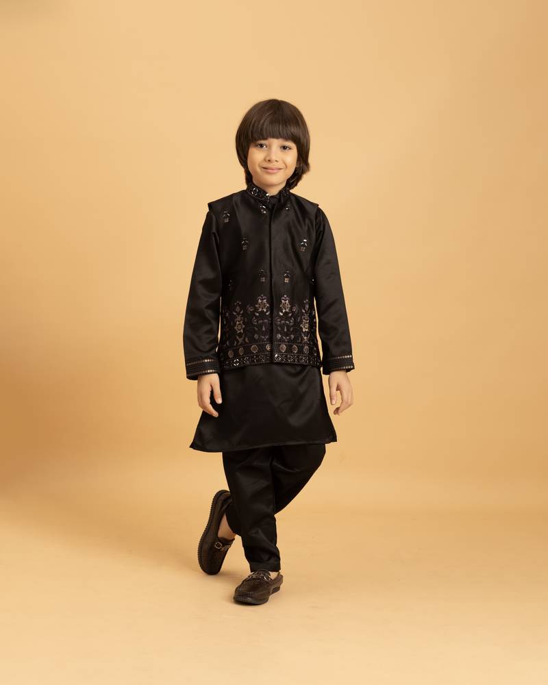 • Product Id : 4692317 • Package Details : 1 Kurta/1 Jacket/1 Pant • Type : Kids Kurta Pyjama • Region : Other • Work : Embroidered • Type : Thread Work • Look : Fashion • Bottom Style : Trouser • Sleeve : Full Sleeve • Neck Style : Round Neck • Bottom Fabric : Satin • Bottom Color : Black • Top Color : Black • Top Fabric : Satin • Stitching : Stitched • Gender : Boy Payments [+]