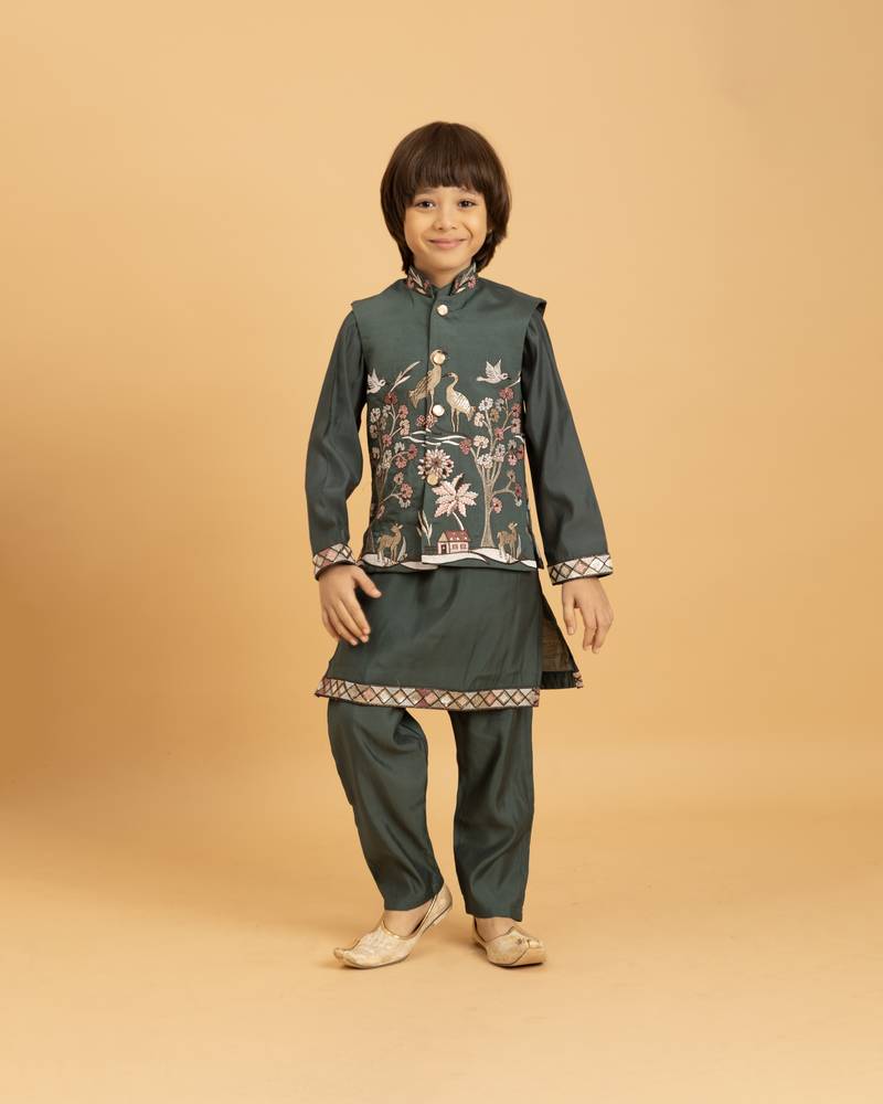 dress your child in this green boys kurta pajama set made from soft viscose silk fabric. the outfit is paired with a matching jacket featuring intricate thread embroidery inspired by traditional floral and bird motifs. designed for comfort and style, this kurta pajama with jacket is a perfect choice for festive occasions, weddings, and cultural celebrations.