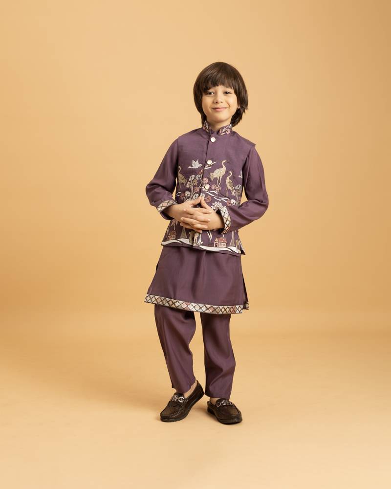 dress your child in this purple boys kurta pajama set made from soft viscose silk fabric. the outfit is paired with a matching jacket featuring intricate thread embroidery inspired by traditional floral and bird motifs. designed for comfort and style, this kurta pajama with jacket is a perfect choice for festive occasions, weddings, and cultural celebrations.