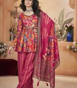Rani Pink Foil With Digital Print Work Silk Anarkali Salwar Suit Palazzo With Dupatta Fstive Party Stitched