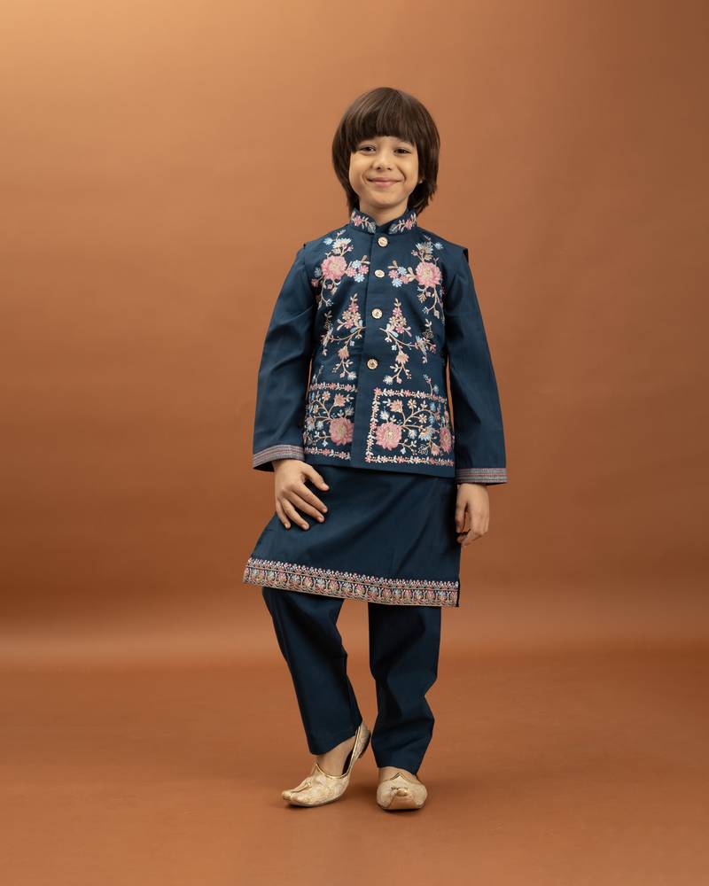 this teal green boys kurta pajama set is crafted from premium viscose silk fabric and enhanced with delicate floral thread embroidery. the outfit comes with a matching embroidered jacket that adds a festive and elegant touch. designed for comfort and style, this viscose silk kurta pajama with jacket is perfect for weddings, festive occasions, and traditional celebrations, offering a rich ethnic look with easy wearability for kids.