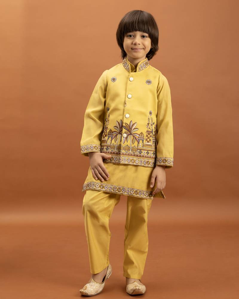 • Product Id : 4690801 • Package Details : 1 Kurta/1 Jacket/1 Pant • Type : Kids Nehru Jacket • Region : Other • Work : Embroidered • Type : Thread Work • Look : Traditional • Bottom Style : Trouser • Sleeve : Full Sleeve • Neck Style : Round Neck • Bottom Fabric : Silk • Bottom Color : Yellow • Top Color : Yellow • Top Fabric : Silk • Stitching : Stitched • Gender : Boy Payments [+]