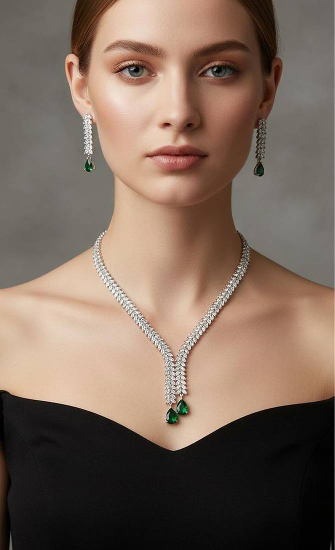 • Product Id : 4732637 • Package Details : 1 Necklace 1 Earring • Type : Necklace Sets • Jewellery Work : Silver Plated • Color : Green • Plating : Brass • Base Material : Alloy Payments [+]