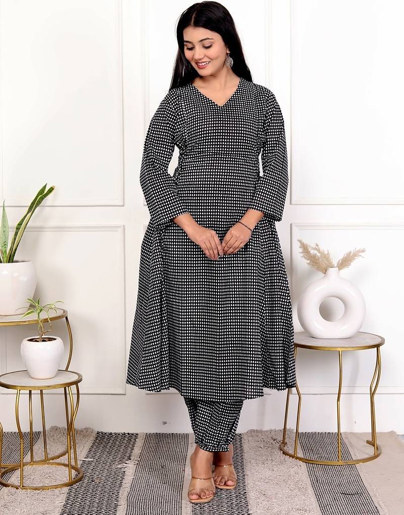 Black Hand Block Printed Cotton Kurta Pant Set
