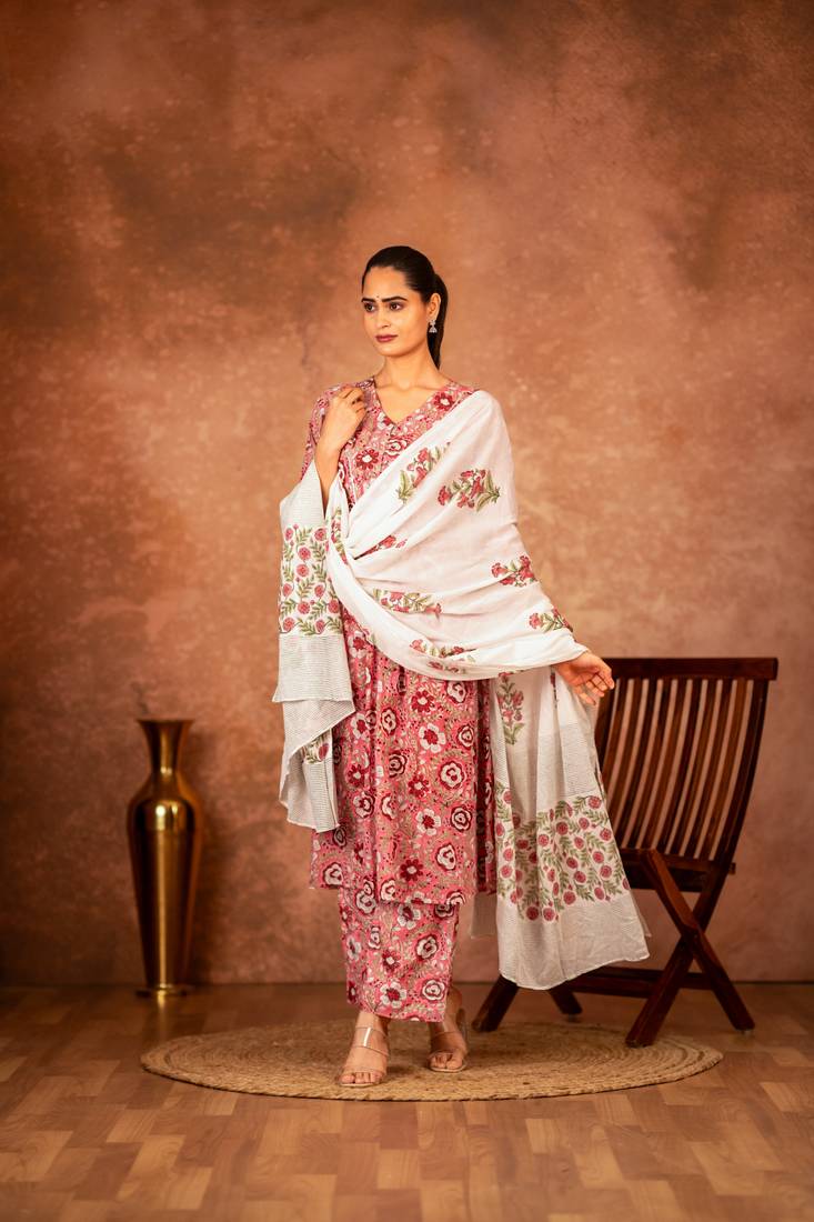 Pink Hand Block Printed Cotton Suit Set Of 3 Stitched