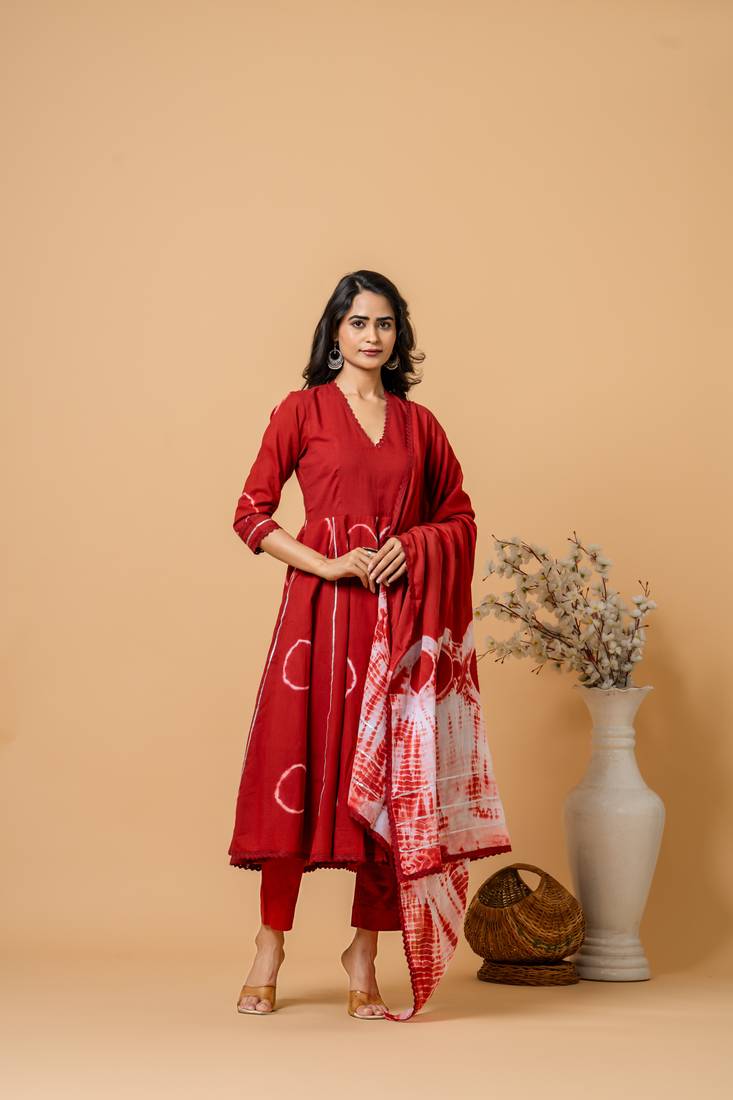 Red Green Hand Block Printed Cotton Suit Set Of 3 Stitched